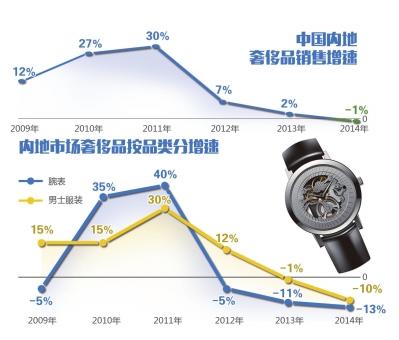2012年6月,我國首次出臺“公款不得採購奢侈品”。貝恩全球合夥布魯諾·蘭納表示,在中國,禮品饋贈歷來是奢侈品消費的重要組成部分。而中國政府推進的反腐倡廉工作對此影響頗大,腕表和以男士消費為主的主力品類增長受限尤為顯著。譬如在2013年下滑1%的基礎上,男士服裝2014年的銷售額再度下滑了10%,僅次于下滑最嚴重的腕表。貝恩調查顯示,腕表品類佔國內奢侈品消費總額的1/5以上,其銷售額在2013年暴跌11%,受挫最為明顯,2014年再度下滑13%。