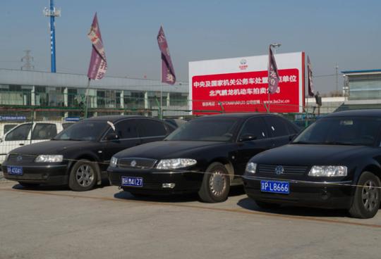 1月22日,待拍的公車停放在北京一家公司的內部停車場。首批中央和國家機關取消的3184輛公務用車已全部封存停駛,首批304輛公車的拍賣即將進行。據悉,參與競拍車輛的車牌號將被交管部門回收。新華社記者 羅曉光/攝