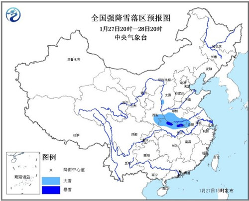 中央氣象臺1月27日18時發布暴雪藍色預警:預計,27日20時至28日20時,山西西部、河南南部、陜西東南部、湖北北部、安徽西部等地的部分地區有大雪,其中,湖北北部、河南東南部的局部地區有暴雪(10∼15毫米);上述地區積雪深度有3∼12厘米,部分地區將出現道路結冰。