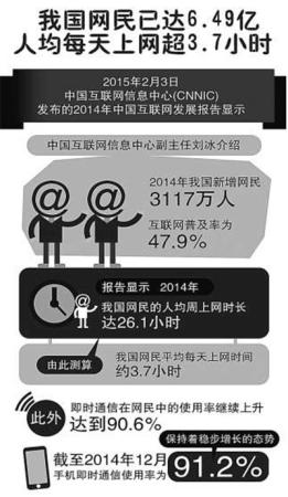 本報北京2月3日電 (記者喻思孌)3日,中國互聯網絡信息中心(CNNIC)發布的第三十五次中國互聯網發展狀況統計報告顯示,截至2014年12月,我國網民規模達6.49億,互聯網普及率為47.9%。其中,手機網民規模達5.57億,較2013年底增加5672萬人,手機作為網民第一大上網終端設備的地位更加穩固。