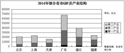 國際經驗表明,隨著人均GDP和城鎮化率的提高,服務業逐步成為吸納勞動就業的主渠道,擴大第三產業的比重是科學發展的趨勢。而從目前看,以工業和建築業為主的第二產業依然是增速最快的產業。根據福建省統計局發布的數據,2014年第一產業增速4.4%,第二產業增速11.7%,第三產業增速8.3%。與往年相比,三大產業的比重變化不明顯,第二產業仍是福建省的核心支柱。