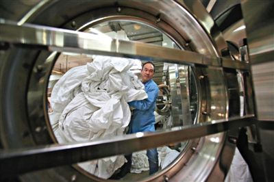 這座5層青色小樓,有一個面積1000多平方米的洗滌間。春運期間,這里的洗滌總量從3萬件增加到5萬件。