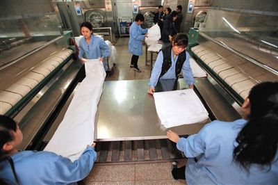 熨燙機另一端,床單平整地從滾軸上下來。工人小王和小葉同時用左手抓住一角,右手在中間一切,床單被迅速對折。小王將手里的床單扔向小葉,小葉雙手接住,剛好和自己手里的一條邊合並,一抖一折,床單就疊好了。10個一摞,平平整整,有棱有角。