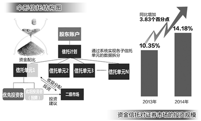 股市的上漲與傘形信托規模的增長,是一個相互強化的過程。中國信托業協會日前發布的數據顯示,2014年度,資金信托對證券市場的投資規模(按投向統計)為1.84萬億元,佔比為14.18%,較之2013年末,同比增加3.83個百分點。