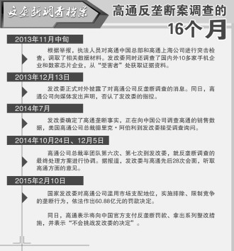 據國家發改委通報,2013年11月,該委根據舉報啟動了對高通公司的反壟斷調查。在調查過程中,國家發改委對數十家國內外手機生產企業和基帶芯片制造企業進行了深入調查,獲取了高通公司實施價格壟斷等行為的相關證據,充分聽取了高通公司的陳述和申辯意見,並就高通公司相關行為構成我國反壟斷法禁止的濫用市場支配地位行為進行了研究論證。