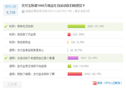 有人在微博發起投票:支付寶所謂1000萬現金紅包活動你們啥感覺?