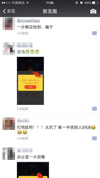 頗感“安慰”的是,辦公室其他小夥伴一個都沒中之外,小編的朋友圈也是吐槽聲一片,搶不到的,喊騙子的,罵太坑了的,哭一毛錢都不給我的,更有心塞的:“你們好歹還有東西戳,我從9:59開始到現在完全處于對著支付寶錢包首頁發呆的狀態!”