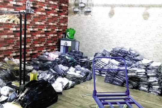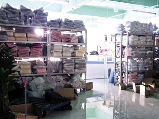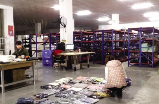 ■一家出口服裝的跨境電商公司,貨物堆積如山,員工正在分揀產品。