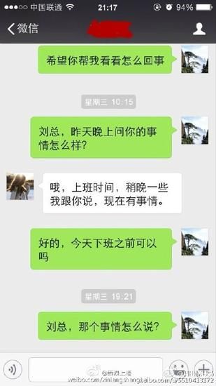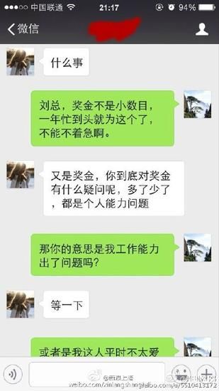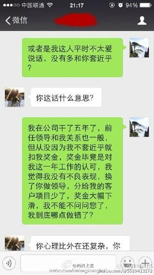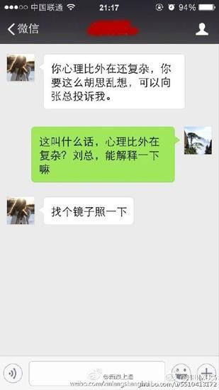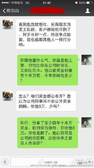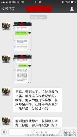 根據“月出驚弓鳥”曬出來的微信截圖,女主管出言不遜:“拿個鏡子照一照”、“長成豬頭那樣,還嫌年終獎少了”、“看到他就想吐,長得跟東海龍王似的。