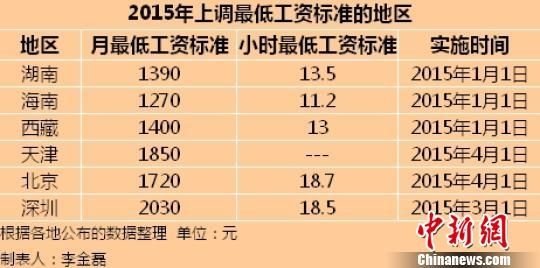 據中新網記者不完全統計,進入2015年來,先後有湖南、海南、西藏、天津、深圳、北京等6個地區宣布提高最低工資標準,其中深圳提高到2030元/月,最低工資標準首次超過兩千元大關,成為目前全國最高的地區。