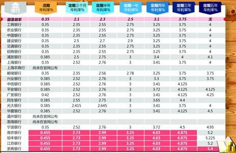 相較工、農、中、建、交等幾家大行,一些股份制銀行的存款利率上浮幅度要大得多。降息後不久,浙商銀行、恆豐銀行、南京銀行、江蘇銀行,便率先將所有期限存款利率在央行基準利率的基礎上,上浮30%,其中,浙商銀行的5年期存款利率更高達5.4%。而去年11月央行降息後,這幾家銀行也將各檔存款利率,一舉上浮至當時的1.2倍上限。目前上海市場的20余家主流銀行中,只有上海農商行、渤海銀行、溫州銀行等少數幾家銀行尚未更新利率。