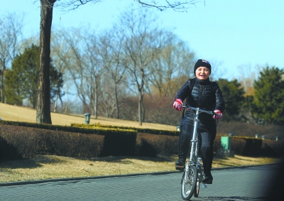 昨天,北京代表團吳碧霞代表騎著自行車到駐地報到,這是她連續4年騎車上會。本報記者 戴冰攝