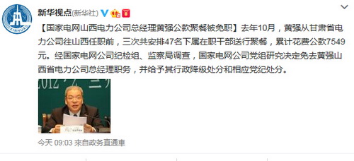 @新華視點:【國家電網山西電力公司總經理黃強公款聚餐被免職】去年10月,黃強從甘肅省電力公司往山西任職前,三次共安排47名下屬在職幹部送行聚餐,累計花費公款7549元。經國家電網公司紀檢組、監察局調查,國家電網公司黨組研究決定免去黃強山西省電力公司總經理職務,並給予其行政降級處分和相應黨紀處分。