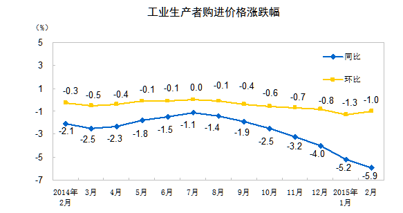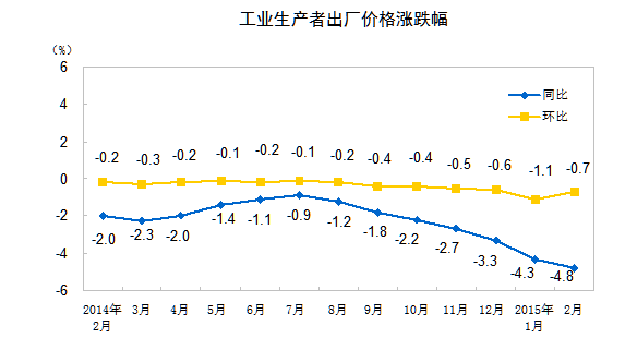 2015年2月份,全國工業生產者出廠價格同比下降4.8%,環比下降0.7%。工業生產者購進價格同比下降5.9%,環比下降1.0%。1-2月平均,工業生產者出廠價格同比下降4.6%,工業生產者購進價格同比下降5.5%。