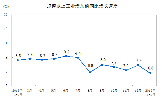 人民網北京3月11日電 (楊曦)國家統計局今日公布數據顯示,2015年1-2月份,規模以上工業增加值同比實際增長6.8 %(以下增加值增速均為扣除價格因素的實際增長率), 比2014年12月份回落1.1個百分點;從環比看,2月份比上月增長0.45%。