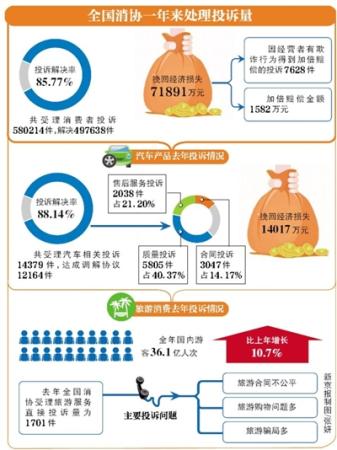 中國消費者協會副會長兼秘書長常宇介紹,從去年3月15日起截止到今年3月1日,全國消協組織共受理消費者投訴580214件,解決497638件,投訴解決率85.77%,為消費者挽回經濟損失71891萬元。其中,因經營者有欺詐行為得到加倍賠償的投訴7628件,加倍賠償金額1582萬元。