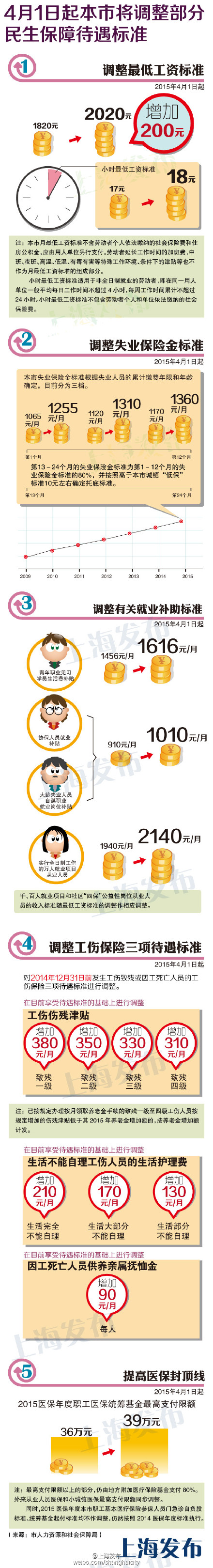 【新民網 獨家報道】4月1日起,一係列民生保障待遇標準調整。其中,上海月最低工資標準從1820元增至2020元,小時最低工資標準從17元增至18元。同時調整的還包括失業保險金標準、有關就業補助標準、工傷保險三項待遇標準,以及職工醫保年度統籌基金最高支付限額等。