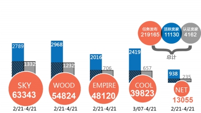 研究團隊將這些交易平臺稱為“賣家信譽升級地下交易市場”(簡稱SRE市場)。研究團隊監測五個這樣專門從事淘寶刷單任務的交易市場,將它們簡稱為“SKY、WOOD、EMPIRE、COOL、NET”。