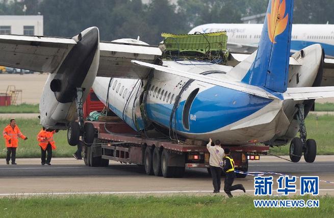 5月10日,救援人員在起吊事故飛機。當日,幸福航空一架MA60飛機在執行JR1529義烏至福州的航班過程中,在福州機場落地時衝出跑道。至17時10分許,事故飛機被成功起吊至拖車上,拖離現場。新華社記者姜克紅攝