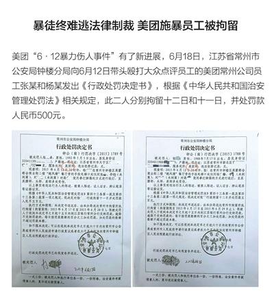 昨天,大眾點評官微發布聲明稱:6月18日,江蘇省常州市公安局鐘樓分局向6月12日帶頭毆打大眾點評員工的美團常州公司員工張某和楊某發出《行政處罰決定書》,根據《中華人民共和國治安管理處罰法》相關規定,此二人分別拘留十二日和十一日,並處罰款人民幣500元。