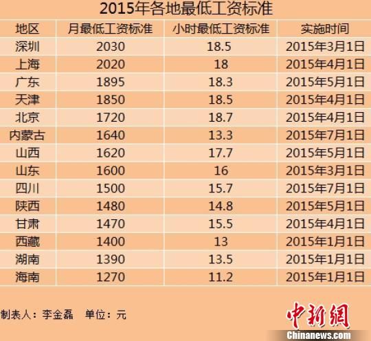 進入7月份,四川、內蒙古均上調了最低工資標準。據中新網記者不完全統計,截至目前,全國至少已有14個地區上調了2015年最低工資標準。其中,上海、深圳兩地最低工資水平超過2千元大關。