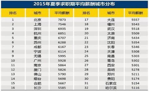 某機構近日發布2015年第二季度全國32個主要城市職位平均月薪。北京以7873元居榜首,上海、深圳隨後,廣州平均薪酬為5928元,居于杭州、蘇州、寧波等城市之後,居全國第10。這是智聯招聘昨日發布的第二季度《中國雇主需求與白領人才供給報告》中披露的。