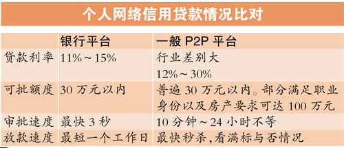 分析指出,銀行布局互聯網金融平臺,搶佔個人和企業用戶,對P2P平臺本身來說是一種很大的競爭,記者對比發現,銀行在互聯網提出的信用貸款申請,也有著和P2P平臺拼速度拼利率的架勢。
