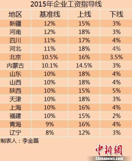 在這14個地區中,新疆、河南的基準線最高,為12%;在工資增長上線方面,天津、山西、山東、河北、河南均為18%,並列第一;而工資增長的下線,陜西最高,為5%。
