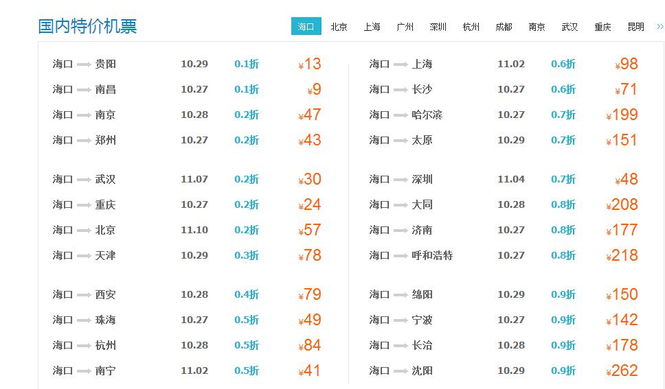 目前海口至重慶、武漢、鄭州、南昌等航線的低折扣機票已跌破了1折,最低達到0.6折左右,其中海口-重慶機票最低價格更是達到100元。杭州、貴陽、昆明等熱點旅遊城市的1-2折機票讓人眼花繚亂。北京、上海等商務航線1.5折左右的票價在各航空公司隨處可見。平日里不可想象的沈陽、哈爾濱、烏魯木齊、蘭州等遠程航線2折票價也終于出現……真是遍地白菜價!而海口到貴陽、武漢的價格更是跌破白菜價,票價分別是60元及80元!