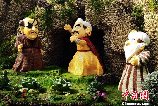 第十七屆中國(壽光)國際蔬菜科技博覽會展出中用鮮活菜果為“材料”制作的文化藝術創意景點——阿里巴巴和四十大盜。 梁犇 攝