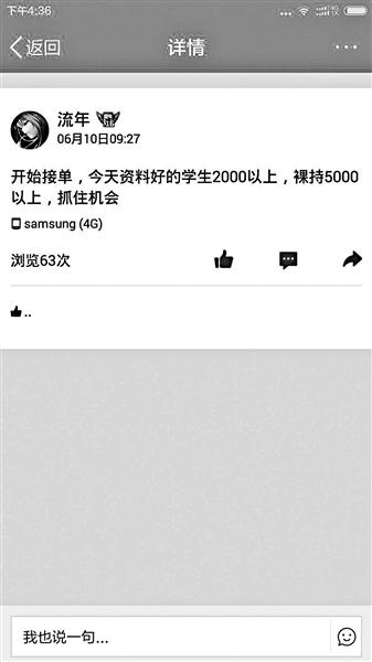 在一名中介的QQ空間里,北青報記者看到,中介多次發布類似“開始接單,今天資料好的學生2000以上,裸持5000以上”的消息。此外,中介還曾發布消息稱,“想看裸照的”可以私信聯係他,都是“跑我單的”,並且有“詳細資料”。