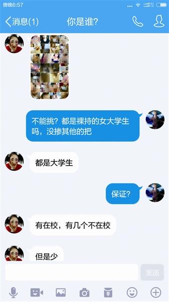 隨後,北青報記者添加其他幾名出售者發現,這些出售者手里的“裸持”照片多數相同,隨後,記者提出希望買最新“裸持”資源,其中一名出售者提供了一個QQ號碼,添加後,對方稱自己是“裸持”放貸人,有最新資源,但價格為30元一組,且一組僅有2-4張照片及一段視頻。對方表示,“裸持”照片中的女性均為大學生,“有幾個在校,有幾個不在校的”。記者詢問是否因為貸款“逾期”才被放出裸照,對方並未應答,但表示資源能夠定時更新,並提出讓記者花300元一次性購買其手上的十一組照片及視頻。