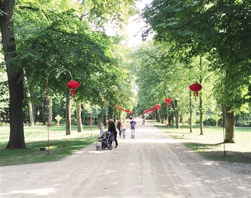 波蘭首都華沙的瓦津基公園有一條“中國大道”,是中波友好交往的歷史見證。圖為遊客走在兩邊挂著紅燈籠的“中國大道”上。 經濟日報記者 王志遠攝