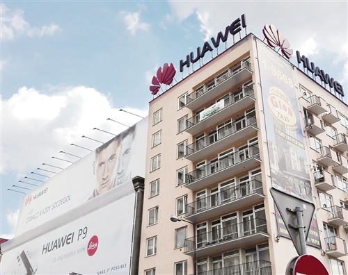 華為公司已經成為波蘭主流運營商的戰略合作夥伴。圖為在華沙市中心商業區,華為公司的廣告牌非常醒目。 經濟日報記者 王寶錕攝