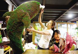為了紀念達沃斯中國十周年,本屆天津夏季達沃斯論壇的花卉裝飾主題特地首次引入了雕塑造型的理念。目前,花藝布展人員正加班加點迎接論壇,力爭將最完美的形象展現給全世界。圖為海豚雕塑主體已開始最後的裝飾,論壇期間,它將成為津城的象徵。(記者 錢進 通訊員 尹君 攝影報道)