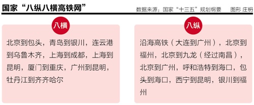 國家“十三五”規劃綱要顯示的中長期高鐵網示意圖(到2030年)表明,“八橫”是指,北京到包頭,青島到銀川,連雲港到烏魯木齊,上海到成都,上海到昆明,廈門到重慶,廣州到昆明,牡丹江到齊齊哈爾等8條高速鐵路通道。