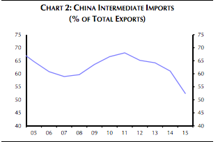 下圖顯示了2005年至2015年中國半成品進口額佔全球出口額的比例的變化