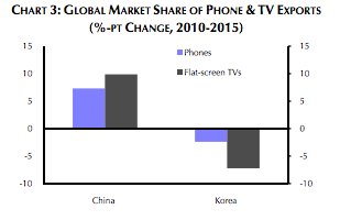 中國現在生產過去常常進口的半成品,並且生產和出口一些高端技術產品,例如手機和寬屏電視機,而生產這些產品此前一直是韓國的專長。