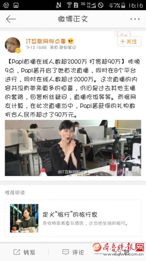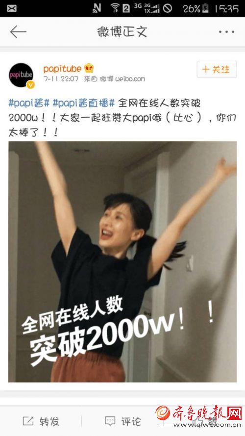 昨晚,集美貌與才華與一身的papi醬在八大平臺直播,根據papitube通報的數據,全網在線人數超過2000萬。