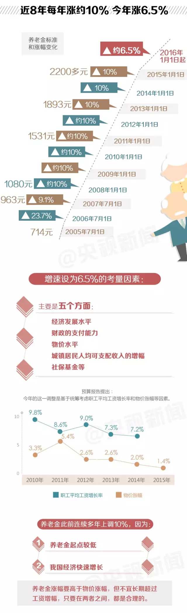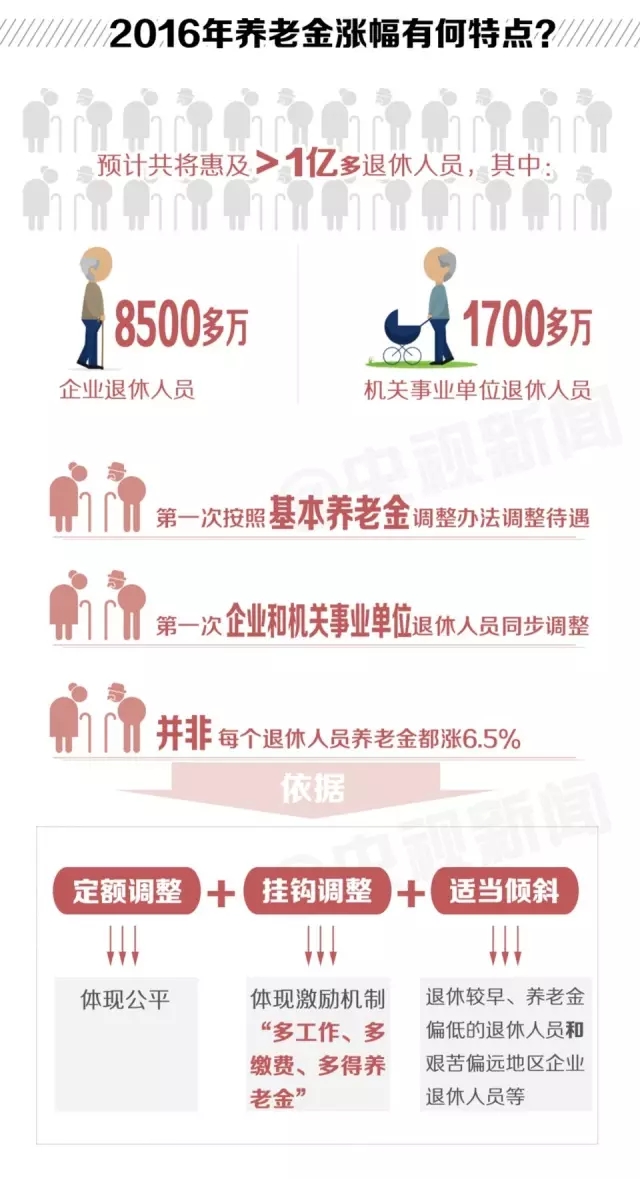 今年3月,李克強總理在政府工作報告中宣布企業退休人員養老金上漲6.5%。4月初,人社部、財政部印發了《關于2016年調整退休人員基本養老金的通知》。