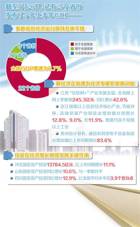 今年上半年,我國克服了多重困難和挑戰,GDP增速為6.7%,保持了總體平穩、穩中有進、穩中有好的發展態勢。從各省的成績單看,多數省份經濟運行也保持總體平穩。