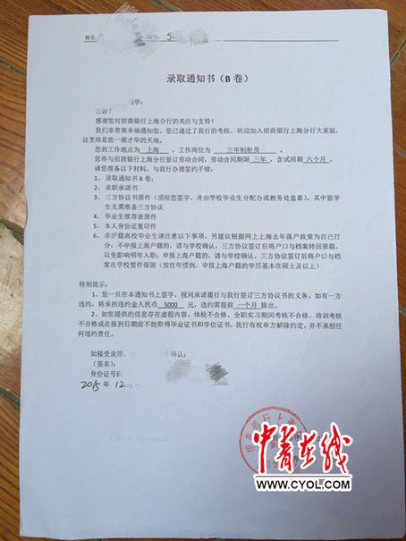 經過長達3個多月過五關斬六將的招聘環節,她在2015年12月收到了寫著“歡迎加入招商銀行上海分行大家庭”的錄取通知書,並與該行及所在高校簽訂了《普 通高等學校畢業生、畢業研究生就業協議書》。隨後,她到該行參加了實習。但在最近4天內,招行通知她,要麼另尋高就,要麼在不簽訂勞動合同的情況下,自9月起重新實習2個月,視實習考核結果再做決定。