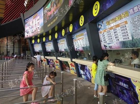 電影樂園正門右側的售票處,12個售票窗口中只有兩個開放,其中一個暫停服務,另一個有6人正在排隊購票。