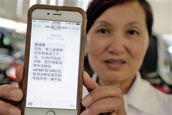 昨日上午,記者來到位于八公里軌道站附近的二手車交易市場。據經營戶江女士介紹,從7月31日上午8時開始,包括她在內的市場中近20戶經營戶的手機都收到了一個陌生號碼發來的威脅短信,短信稱將連續呼叫他們3個月,如果想取消呼叫,就要向其指定的微信號中發100元紅包。