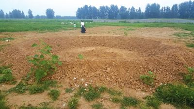 在周口港口物流產業集聚區(簡稱“周口港區”)一條新修的名為“巴鐵大道”的公路一側,被白色圍牆圈起的數百畝土地荒草叢生,草叢內零星散落著石塊,有人趕著羊群在圍牆內吃草。在沒有荒草的中間區域,赫然出現一個新挖的直徑約10米的大坑,幾個孩童在爬上爬下。