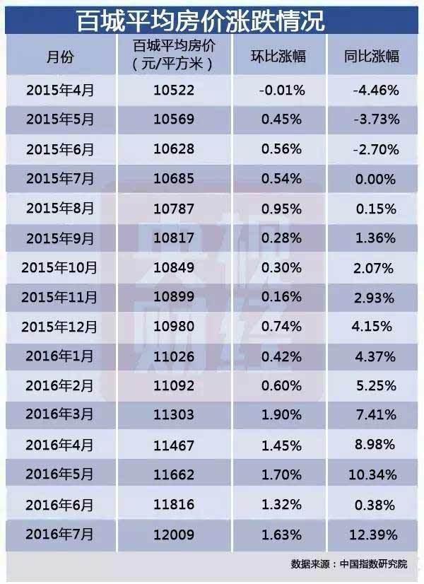 近一年來樓市的升溫直接反映在了房價上。中指院百城房價報告顯示,去年7月份10685元/平方米的百城平均房價,一年後漲到了12009元/平方米,漲幅約12.39%。