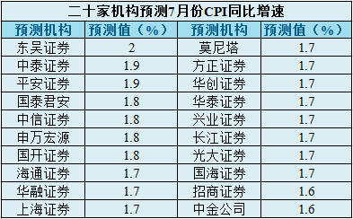 華泰證券首席宏觀研究員李超分析稱,7月份以來,受洪澇災害影響,農產品價格有所回升,豬肉價格處于持續回落階段;同時,經濟增長下行壓力大,內生動力不足難以維持物價水平的上漲。因此,預計7月份CPI同比增1.7%。