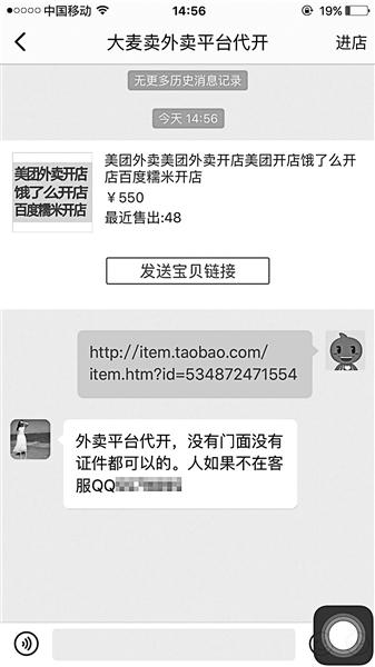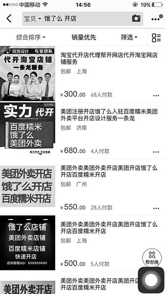北青報記者在淘寶網上輸入“美團 餓了麼 代辦”等關鍵詞後,檢索頁面的確顯示至少十多家店鋪自稱可代辦“外賣平臺開店”業務,而報價自50元至1000元不等。抱著質疑的態度,北青報記者隨機聯係了幾家店鋪的客服人員,詢問對方在送餐平臺上代開店需要滿足什麼條件,得到回復稱“沒有門面、沒有證件都可以(代辦)”。