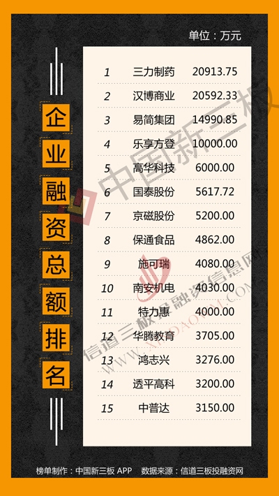 編者按:中國新三板APP、中國網新三板(finance.china.com.cn)聯合信道三板投融資信息網(www.i-neeq.com)發布“新三板融資排行榜”,通過對公司公告的收集梳理,按照公司、行業、地區、券商等指標,以周為周期篩選出每個指標的前15名。通過上述排名,讓業界更加了解新三板融資的最新動態,以擴大新三板影響力,從而促進新三板更好地服務中小企業和推動中國實體經濟發展。