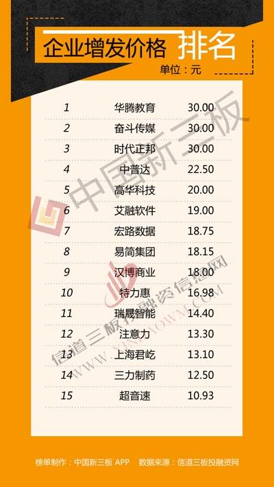 增發價格方面,本期並無太大亮點。華騰教育、奮鬥傳媒、時代正邦均以30元/股並列該指標第一位。公告顯示,華騰教育3705萬元募資主要用于金用于渠道建設及補充流動資金;奮鬥傳媒1500萬元募資主要用于補充公司發展所需運營資金,豐富產品類型,擴大業務規模,以提升公司競爭力和抗風險能力;時代正邦738萬元募資則主要用于補充流動資金。